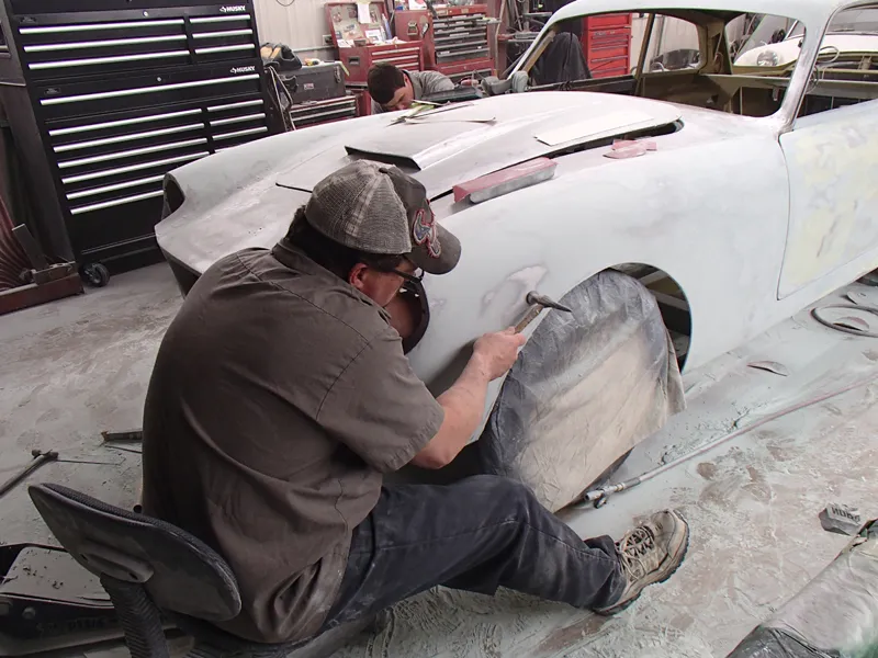 Johnny is straightening the aluminum in the front fenders, as Dee and Andrew continue body work.