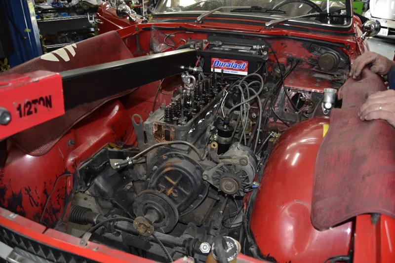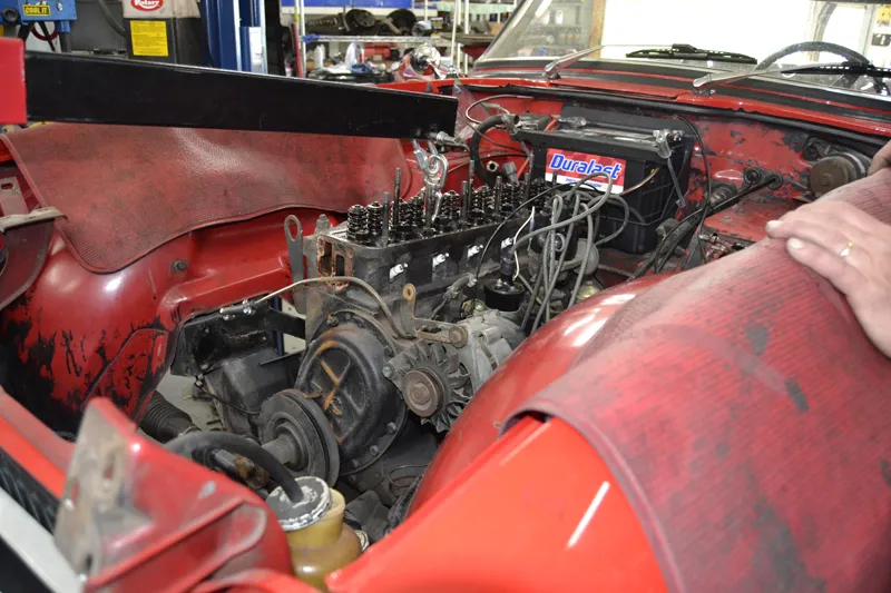 In building the motor, we used Tri-metal main and rod bearings and NOS Vandervel thrust washers as thrust has always been a problem in TR6 engines. The camshaft and lifters were provided by Richard Good of Good Parts and are a GP2 designation. New dual chain, gear, and tensioner, new oil pump and relief valve. All galleys that had driven plugs were drilled and tapped, and sealed with hex set screws. Next, the head was Magnafluxed and pressure tested to determine there were no cracks, then received new hardened seats, stainless steel intake valves, and stellite exhaust valves. Magnesium bronze guides were installed and the combustion chambers were cc’d, showing 61ccs, give or take, in all chambers. We then port matched the tri-carb set up intake and header to the head,flowed the openings to port match, and removed any casting marks or slag inside the runners. We determined that 43.5 ccs would bring us to 9:92 compression ratio, which is close to the end of 93 octane pump gas. In order to achieve that cc, we surfaced the head from 3.390 to 3.550, a total of .160 removed. All edges were de-burred and chambers smoothed. New dual springs with total seals were installed.