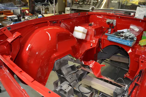 When installing the head, a Payen composite gasket was used along with ARP head studs and rocker studs. A beautiful 1.65:1 roller rocker setup was installed as supplied from Good Parts. We set the cam at 7 degrees advanced with a .050 clearance on the #1 intake. The entire motor was then painted after painstakingly being sealed, and is now ready to install back into the car.