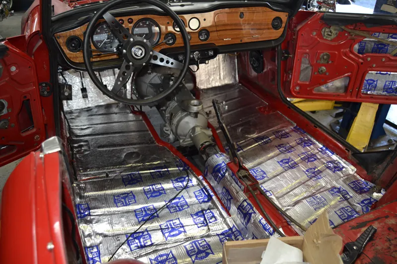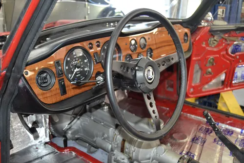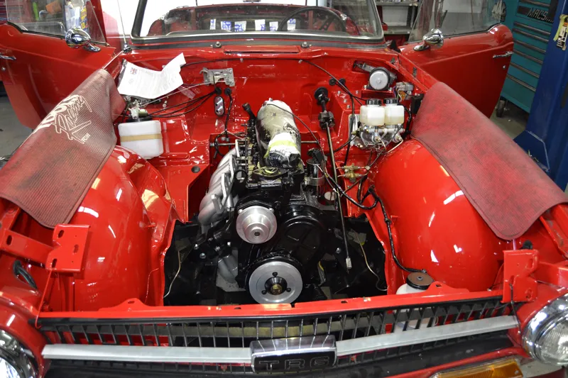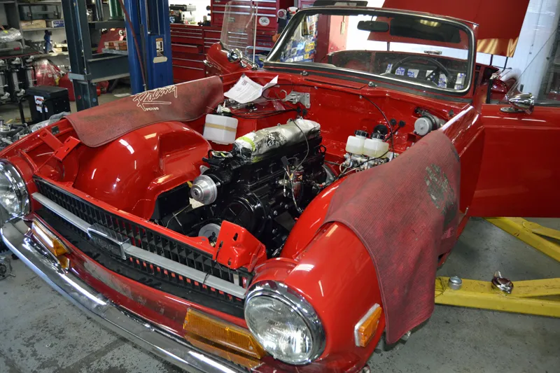 After purchasing and falling in love with this TR6, the owner decided to have performance upgrades done on the car to improve power, handling, and aesthetics. Upgrades included new wool carpets, new door panels, new wooden dash, new speakers and sound system, restored steering wheel, engine compartment restoration, aluminum radiator, triple Stromberg carbs, exhaust header and exhaust system, Wilwood brakes, Good Parts anti-sway bar and spindles, new chrome wire wheels, new tires, and a rebuilt transmission.