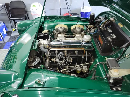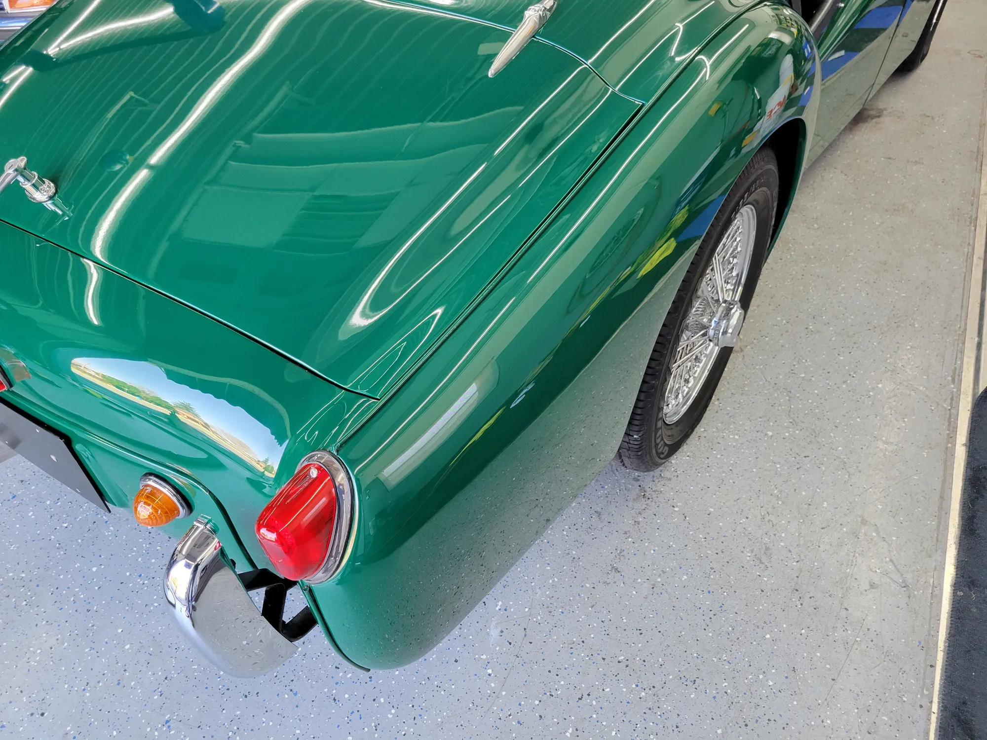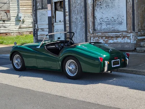 Very unusual RHD, we purchased this car recently from a gentleman who has owned it for 3 years. He purchased it from the gentleman who commissioned the restoration. A full frame off very nicely detailed and very comprehensive was done. Well detailed underneath chassis and underside of the car with all new suspension, koni shocks and bushings. Car was lowered approximately 1 inch which creates a very aggressive look with the addition of the 7 inch Lucas driving lights peering out of the grill opening. Green piping was also put on the body instead of the stainless strips to create more of a smooth racy appearance. The interior is very nicely done in black vinyl with white piping and correct loop carpet. Lifting any of the carpet shows that the entire body shell was stripped, sandblasted, and nicely painted throughout. The body is straight and paint is extremely well detailed and the engine obviously had 87mm pistons and liners installed when it was rebuilt as it is very strong. A 6 blade plastic fan from a TR6 was added to keep the car cool with the extra power, also HS6 carburetors from a TR4A were added along with a T-handle choke knob to eliminate sticking chokes as TR3s with H6s are famous for. Attention to detail throughout the entire car with tasteful modification such as a beautifully painted dash rather than vinyl wrapped. The car rides on a new set of Dayton stainless steel spoked wire wheels with modern radials. A new convertible top in black is being installed at the time of writing this, the car will come with a fitted new Robbins black crush grain top as original.